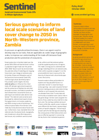Scenario analysis is a useful tool that allows policymakers to explore and map plausible futures in a systematic manner; yet there are few examples of applying the tool at local scales, thereby missing the level of detail needed for a better understanding of local processes. This policy brief outlines scenarios of change to 2050, developed in collaboration with local farmers using serious gaming to map the impacts of future land cover change on biodiversity and ecosystems in North-Western province, Zambia.