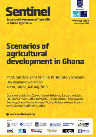 This report summaries the proceedings and outputs of a scenario devleopment workshop, designed to develop a set of plausible scenarios of agricultural development in Ghana. The workshop was organised by the Ghana team of the Sentinel project. A group of 31 stakeholders from a range of organisations participated in the workshop, followed by 2 additional meetings to finalise the storylines. We hope that the scenarios will be useful not just to the Sentinel project (to help refine its research questions) but also to the workshop participants, to support reflections on plausible future challenges and opportunities for Ghana's agriculture.